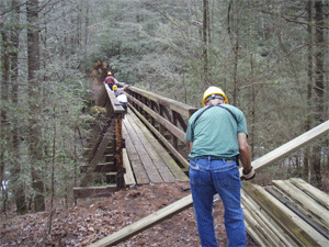 Thursday, April 2, 2009: We had a great group of volunteers, plus Robert Thomas, to work on replacing the decking on the foot bridge across